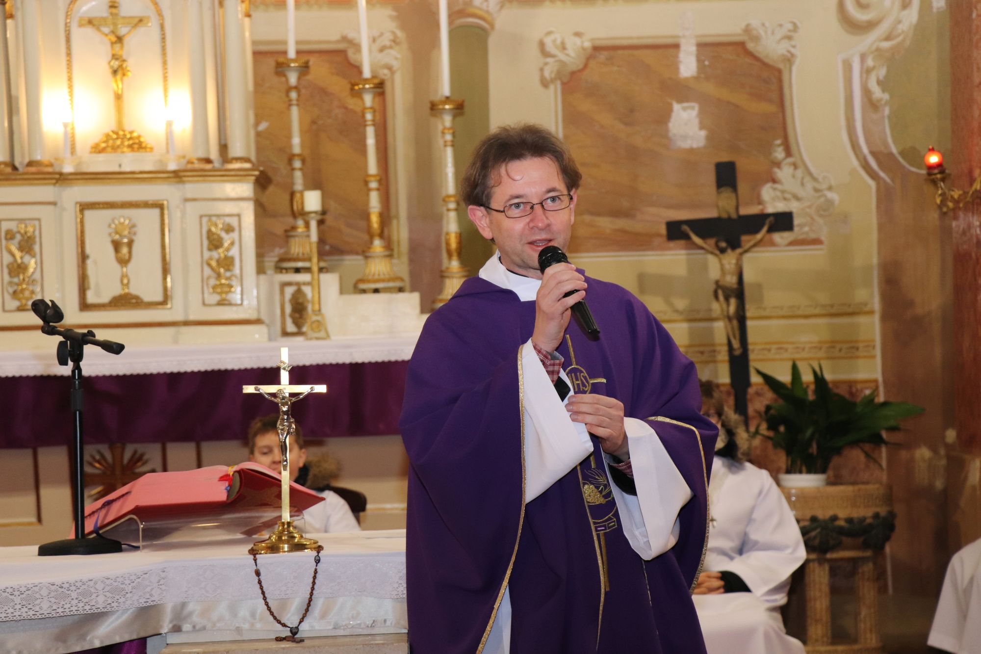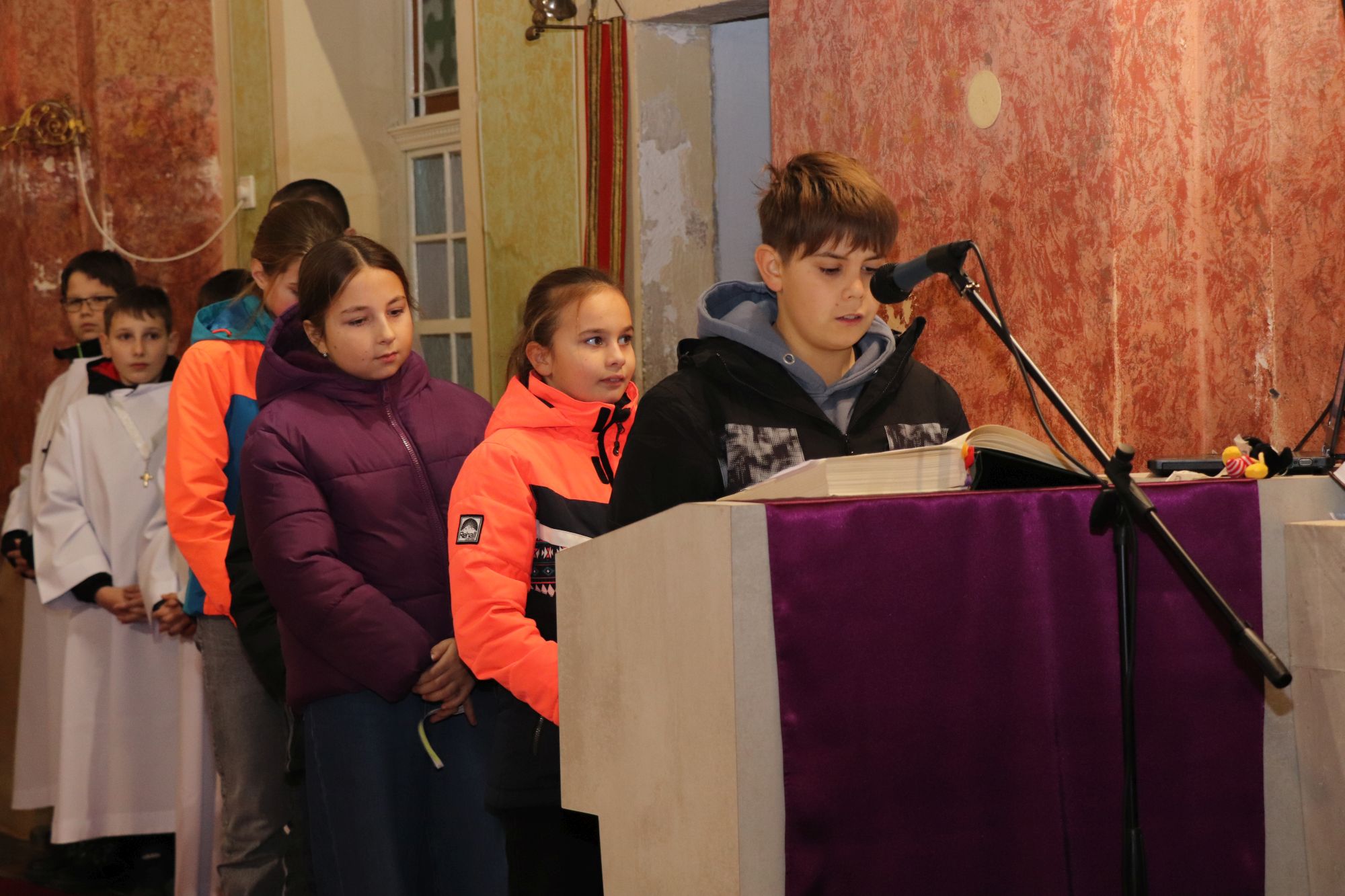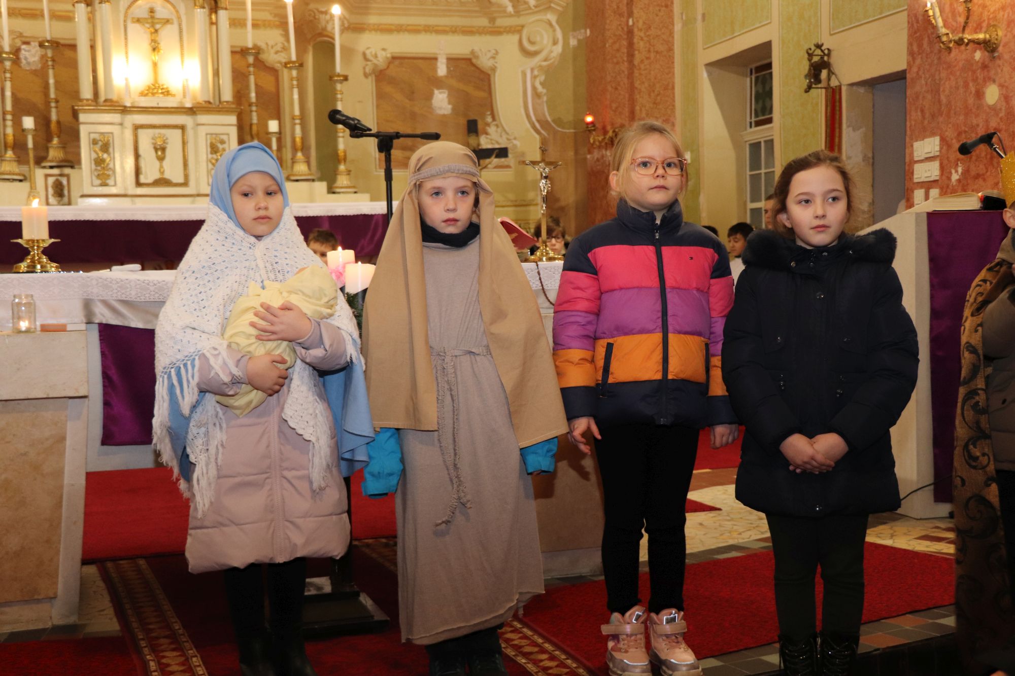 A szentmise liturgikus szövegében, és a gyerekeknek szóló szentbeszédben Dr. Liszkai Tamás plébániai kormányzó egy régi képeslap segítségével idézte fel, ahogy felragyog egy szarvas képe, a fény hordozója és a remény hírnöke. Léptei csendben vezetnek át az éjszakán, ahol a titok rejlik: Isten közeledése az emberhez. Mint az élő vizek után szomjazó szarvas, úgy vágyakozik a világ az irgalom után. E vágy beteljesedik a megszülető Gyermekben, Jézusban, aki világosságul jön minden népnek. Ő a rejtett fény, amely nem vakít, hanem vezet. Hódolattal állunk a titok előtt: az Ige testté lett, és köztünk lakik.